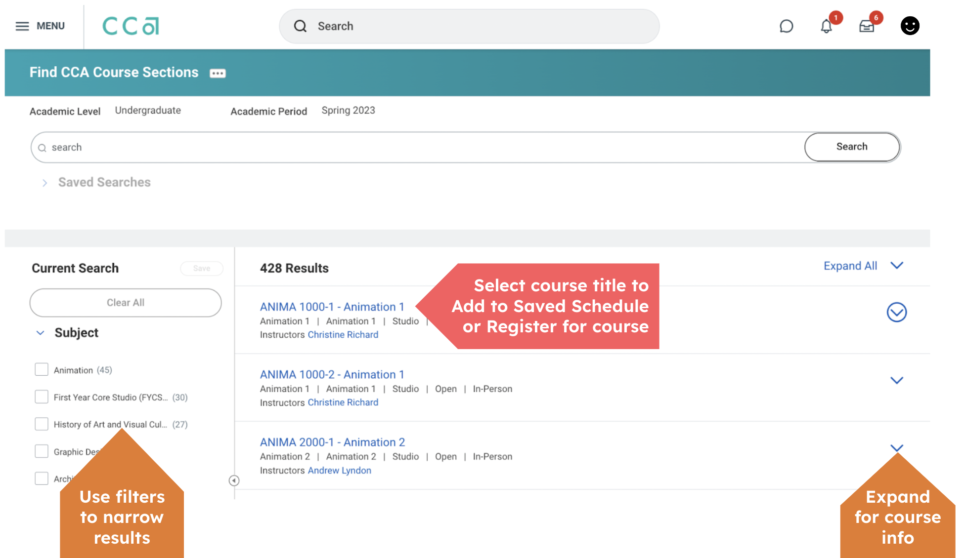 During your registration window, you can register for courses by searching CCA’s course schedule for the upcoming term. For courses with co-requisites, it is best to register from the Academic Plan or a Saved Schedule.